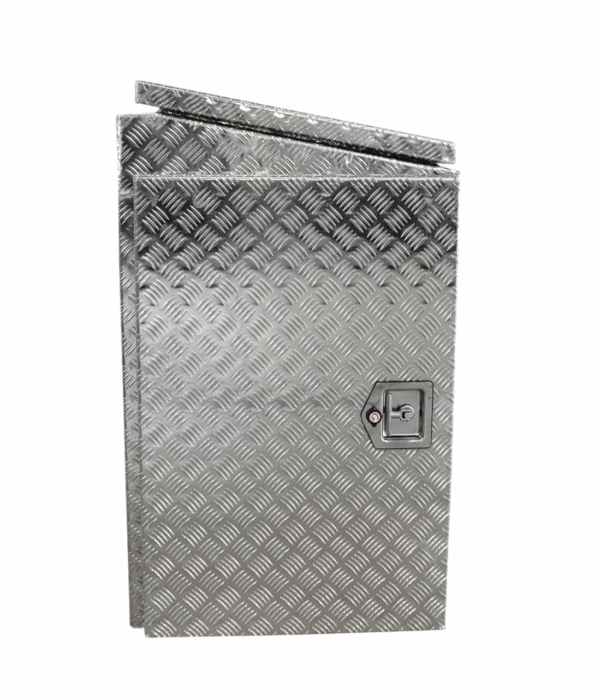 De traanplaatconstructie is licht, sterk en slijtvast. De kist heeft deuren aan beide kopse kanten en een deksel bovenop, ondersteund door gasveren. Daardoor open je het deksel eenvoudig en blijft het stevig openstaan tijdens gebruik. Binnenin is een aluminium vlonder geplaatst voor een stabiele, vlakke bodem.